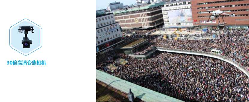 無人機可搭載30倍變焦相機在會場空中盤旋監控,提供高清畫面,并可以快速機動到任何需要的區域上空,遠距離搜索發現地面可疑人員、車輛,提供強有力的空中情報保障。將視頻圖像實時傳輸回指揮中心, 指揮中心根據無人機傳輸回的資料對現場實時掌控, 一旦發現突發情況,無人機可以第一時間發現,極大地提高了應急處理效率