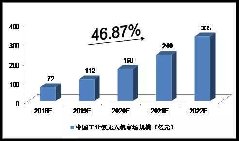 市場規模預測 綜合以上因素,我們預計,2018年中國工業級無人機市場規模將達到72億元,未來五年(2018-2022)年均復合增長率約為46.87%,2022年中國工業級無人機市場規模將達到335億元。