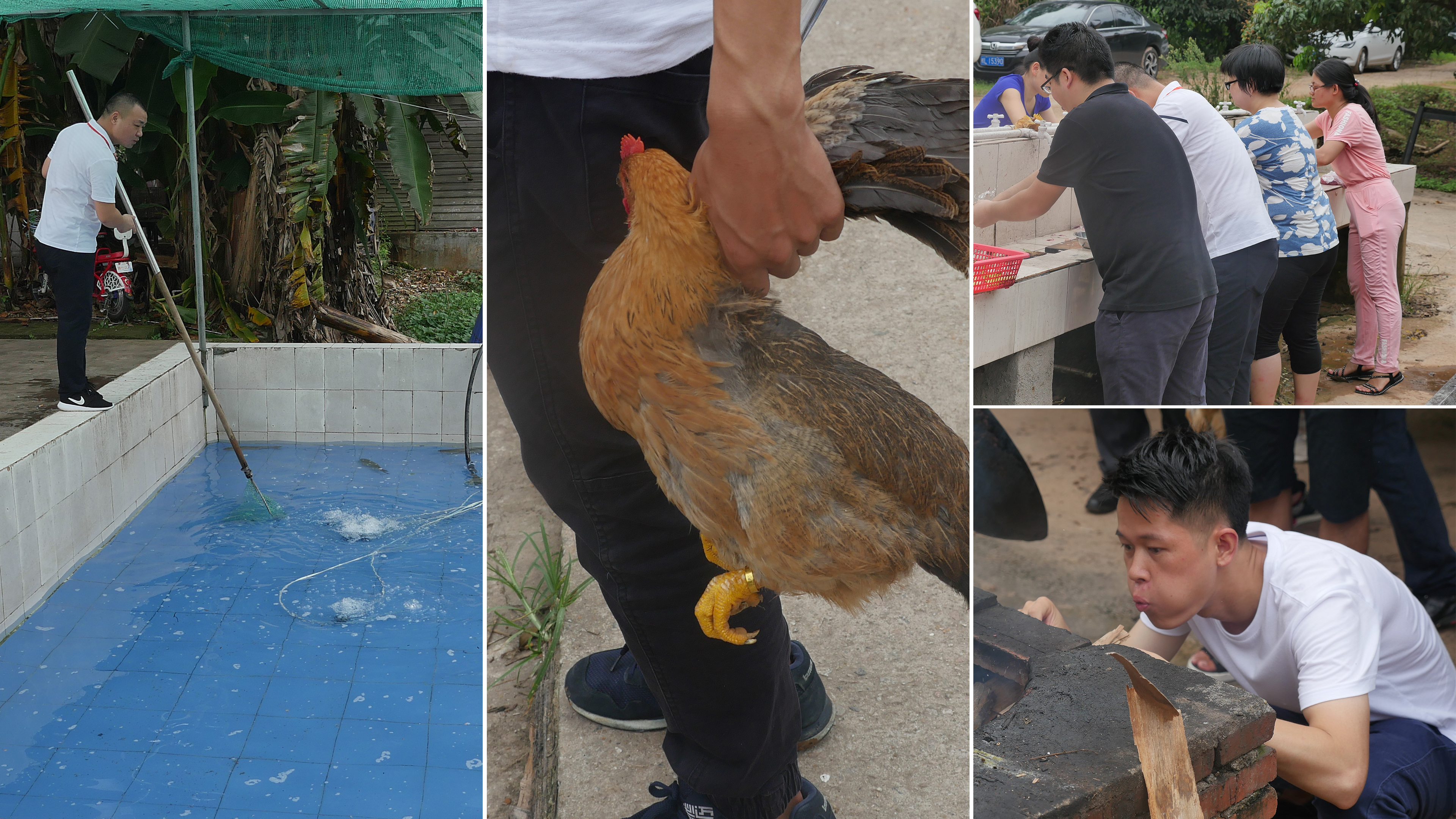 拓展游戲任務完成后,大家都饑腸轆轆,接下來就是展現大家廚藝的時候了!全體員工重新分配成四個隊,在隊長的帶領下開始野炊。雖然天氣炎熱,做飯條件艱苦,但為了吃到可口的飯菜,大家都分工合作,配合得井井有條。撈魚、抓雞、洗菜、生火,所有前期工作都有條不紊的進行著。