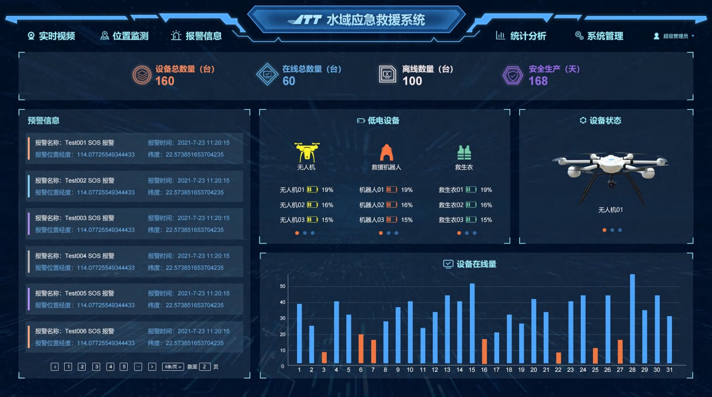 水域應(yīng)急救援系統(tǒng)采用C/S、B/S混合式、多層系統(tǒng)架構(gòu),將水域應(yīng)急救援系統(tǒng)(空中巡查系統(tǒng),水域救援系統(tǒng),作業(yè)平臺AI安全預(yù)警系統(tǒng),救援人員防溺水監(jiān)測系統(tǒng)等)、報警聯(lián)動等全部融合形成統(tǒng)一的平臺系統(tǒng),滿足了水域的應(yīng)急救援需求,大大降低了系統(tǒng)使用難度、管理效率顯著提升。水域應(yīng)急救援系統(tǒng)前端救援設(shè)備包括水域AI攝像機(jī)、救援無人機(jī)、水上救援機(jī)器人、水上救援艇、智能定位報警救生衣、停機(jī)坪、太陽能充電板等,組成空中、水面立體化救援網(wǎng)絡(luò),應(yīng)對不同的水域救援場景需求??蓮V泛應(yīng)用于抗洪救災(zāi)、海邊安全保障、水域管理、消防、交通指揮、邊防巡邏、應(yīng)急管理、部隊、大型保障等。