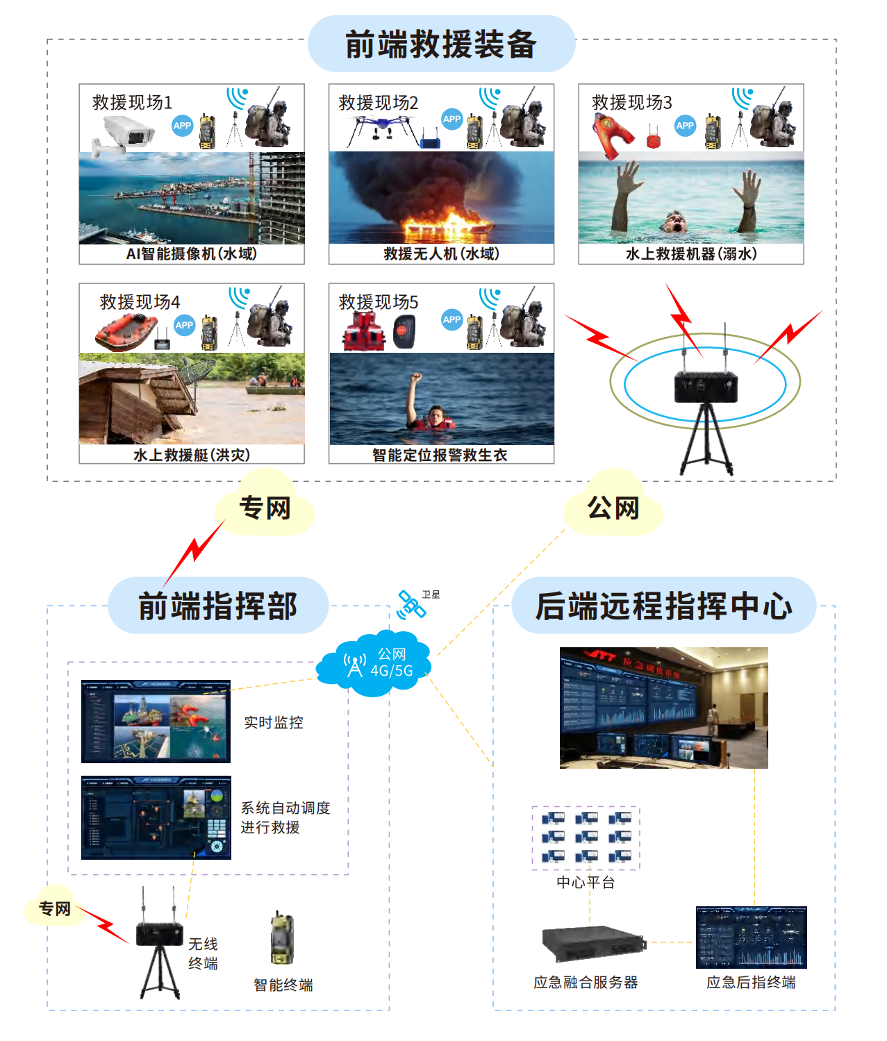 1,據(jù)網(wǎng)絡(luò)情況,選公網(wǎng)+專網(wǎng)通信,選指前端指揮部,一線人員進(jìn)入現(xiàn)場打開現(xiàn)場指揮中心、前端救援裝備,前端(A!智能攝像機(jī)、水上救援機(jī)器人、水上救援艇、無人機(jī)、智能定位報警救生衣等)接入現(xiàn)場指揮中心,現(xiàn)場指揮中心自動接入后端遠(yuǎn)程指揮中心;
