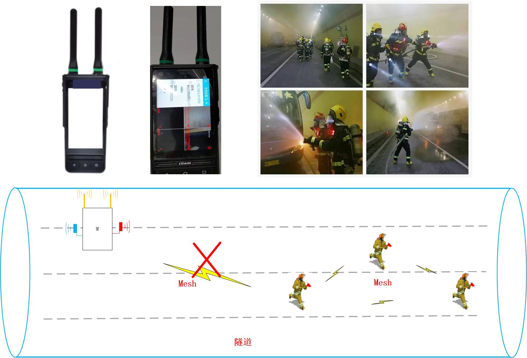 其次,在隧道運營或突發事故(如坍塌、火災)場景下,常規通信極易中斷。此時,Mesh網絡憑借無中心、自愈合、多跳中繼的特性,可由背負電臺、便攜指揮箱等移動節點快速重建局部通信鏈路。救援人員佩戴的智能終端即使在無公網、無核心網條件下,仍能實現語音對講、一鍵報警、視頻回傳等功能,為指揮中心提供現場實時音視頻信息,支撐可視化調度與科學決策。